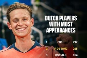 据巴萨官方数据统计,弗兰基-德容为巴萨出战场次已经达到265场,超越罗纳德-科曼,成为代表巴萨出战场次第二多的荷兰球员,仅次于292场的科库。